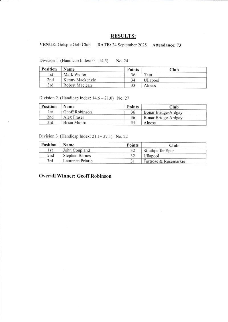 In Divison 2 Geoff Robinson (Bonar Bridge/Ardgay) won the last event to finish with 9 points from Ian Baverstock with 7 points.